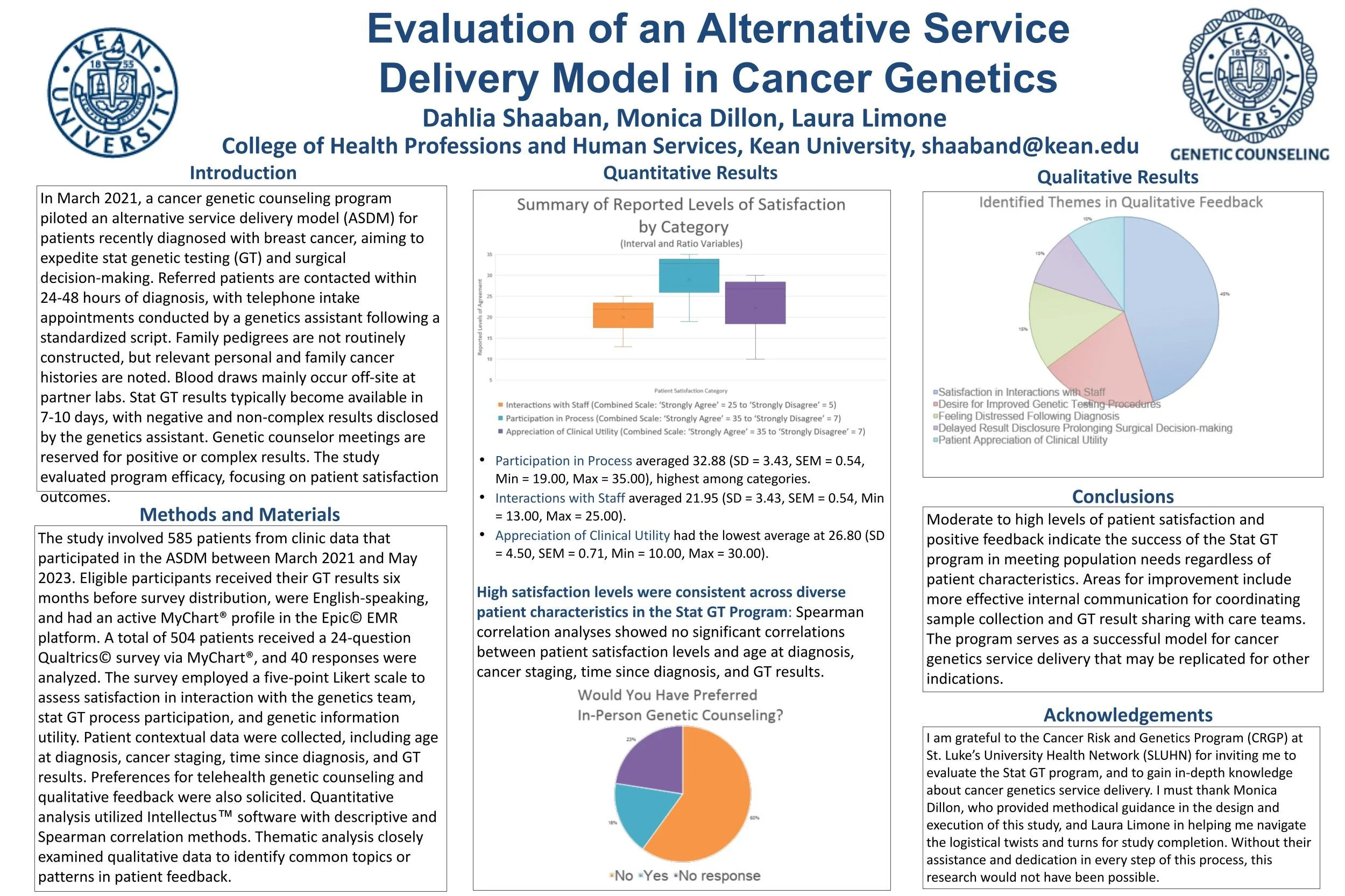 In March 2021, the Cancer Risk and Genetics Program (CRGP) at St. Luke’s University Health Network piloted an alternative service delivery model for patients ages 60 and younger who were recently diagnosed with breast cancer. The program was designed to expedite the turnaround time of STAT genetic testing (GT), allowing patients to receive critical genetic information sooner and facilitate their surgical decision-making process. In a collaboration between the CRGP and the Kean University Genetic Counseling Graduate Program, the principal investigator conducted a program evaluation to assess whether the STAT GT program was effectively designed and implemented to meet the needs of this patient population, focusing on the outcome of patient satisfaction. The research team assessed levels of patient satisfaction regarding interactions with the CRGP genetics team, participation in the STAT GT process, and patient appreciation of the clinical utility of genetic information. A total of 504 patients received a survey which solicited quantitative and qualitative feedback on experiences in the STAT GT program and the responses of 40 participants were included in data analysis. Statistical methods included descriptive and correlation analysis to assess relationships between reported levels of patient satisfaction and contextual data including age at the time of diagnosis, cancer staging at the time of diagnosis, time since diagnosis, and genetic test results. Participants generally reported moderate to high levels of agreement with satisfaction measures, with average reported satisfaction scores ranging from 4.05 to 4.83 out of a possible maximum score of 5.00. Elevated levels of patient satisfaction and broadly favorable feedback reported by participants indicate that the STAT GT program was successful in meeting the needs of this patient population, irrespective of patient contextual variables. The need for improved internal communication was identified as an area for improvement in program implementation, including more effective education and coordination with staff responsible for collecting patient samples at regional SLUHN laboratory sites, as well as more effective sharing of GT results with the breast surgeon and other providers within the patient’s care team to ensure timely surgical decision-making. The STAT GT program has proven to be a successful model of cancer genetics service delivery in advancing patient satisfaction and may effectively be replicated for other indications.