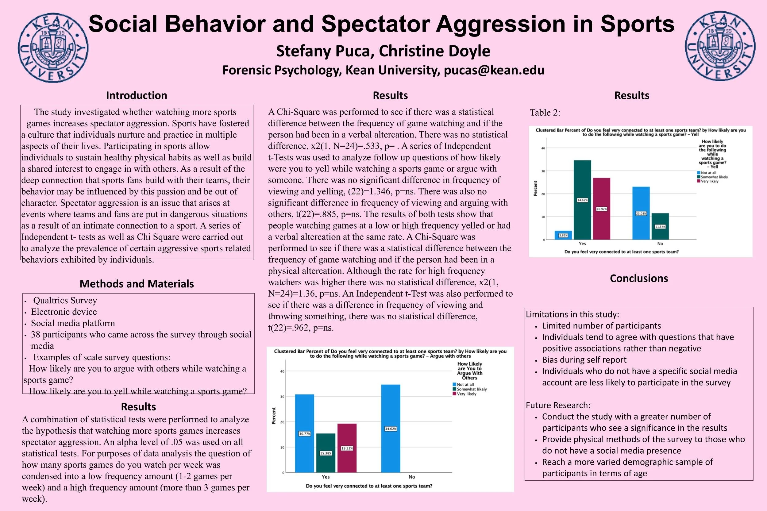 The study investigated whether watching more sports games increases spectator aggression. The materials were a survey, social media platform, and an electronic device. There were 24 participants in the study, all were individuals that came in contact with the survey link on social media. A Chi-Square was performed to find a statistical difference between the frequency of game watching and if the person had been in a verbal altercation. There was no statistical difference, x2(1, N=24)=.533, p=ns. A series of Independent t-Tests analyzed the likelihood of participants yelling while watching a sports game or arguing. There was no significant difference in frequency of viewing and yelling, t(22)=1.346, p=ns. There was no significant difference in frequency of viewing and arguing, t(22)=.885, p=ns. Therefore, people watching games at a low or high frequency yelled or had a verbal altercation at the same rate. A Chi-Square was performed to find a statistical difference between the frequency of game watching and if the person had been in a physical altercation. The rate for high frequency watchers was higher; there was no statistical difference, x2(1, N=24)=1.36, p=ns. An Independent t-Test was performed to find a difference in frequency of viewing and throwing something, there was no statistical difference, t(22)=.962, p=ns. Participants agreed with statements that gave positive associations like: deep senses of fulfillment, over cheated; this is fixed by changing the wording of certain questions.