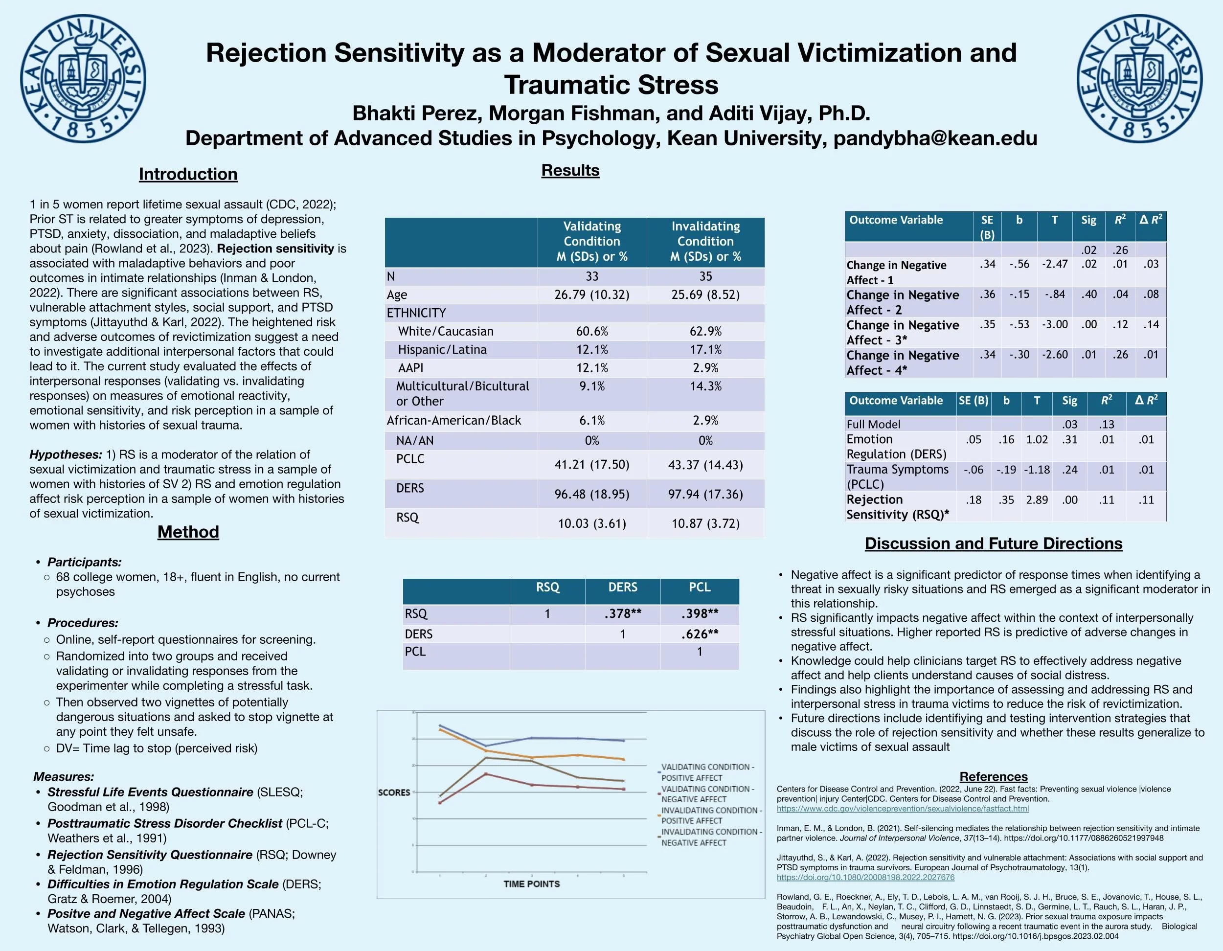Women encounter higher rates of sexual violence, with one in every two women having endured sexual violence including physical contact at some point in their lives (CDC, 2022). Sexual trauma correlates with more pronounced symptoms of depression, post-traumatic stress disorder, anxiety, dissociation, and enduring maladaptive beliefs about pain throughout the six months following the acute traumatic event. (Rowland et al., 2023). The precise nature of this connection is not fully understood. Various variables, such as emotion regulation, general psychological distress, mindfulness, self-compassion, rejection sensitivity, and interpersonal stress, have been suggested as potential moderators influencing the relationship between sexual victimization and symptoms of traumatic stress. These factors are also considered risk factors contributing to a reduced perception of risk. Hence, this study pursued two objectives: Aim 1) to investigate moderators influencing the connection between sexual victimization and symptoms indicative of traumatic stress and Aim 2) to Explore the role of emotion regulation concerning risk perception within a sample of individuals who have experienced sexual victimization. This paper reports 1) findings from a screening sample (N=435) exploring links between emotion regulation, traumatic stress symptoms, psychological distress, mindfulness, self-compassion, and rejection sensitivity and 2) results from an experimental study on the impact of interpersonal responses in women with sexual trauma histories (N=68). Participants completed self-report measures, and in the experimental phase, they received validating or invalidating responses while completing a stressful task. Aim 1) Analyses revealed rejection sensitivity as a significant predictor of psychological distress. Aim 2) Negative affect significantly predicted response times when identifying threats in sexually risky situations. The findings highlight rejection sensitivity's role in influencing negative affect in interpersonally stressful contexts, offering clinicians insight to target rejection sensitivity for addressing negative affect and social distress causes. Managing rejection sensitivity and interpersonal stress is crucial in trauma victims to reduce revictimization risk.
