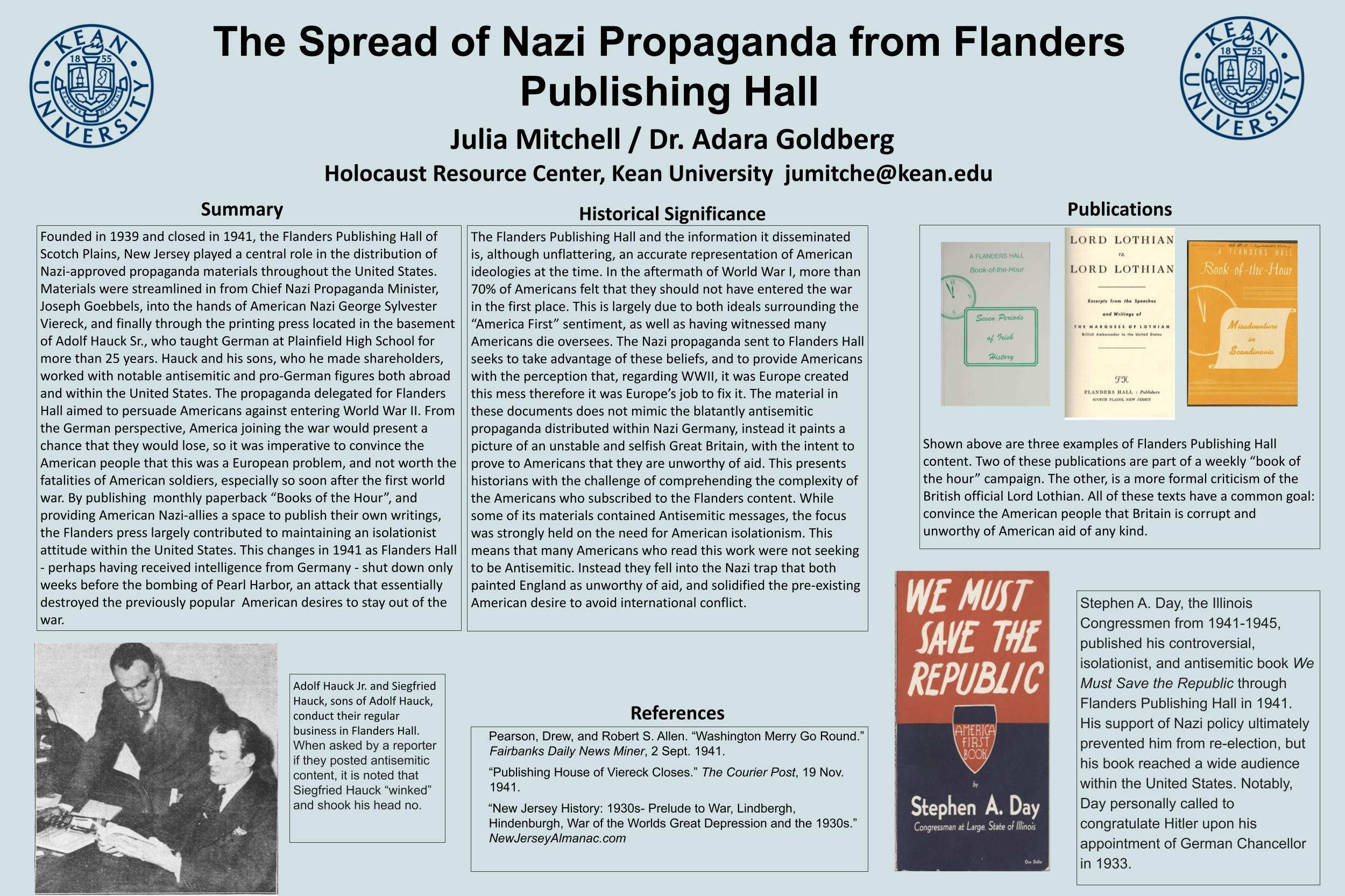 Flanders Hall stands out as a unique manifestation of American isolationism and pro-Nazi efforts following World War I, and highlights the Nazi state’s desire to keep America from entering the war. Laced with antisemitic rhetoric, the propaganda published by Flanders Hall largely focused on delegitimizing Great Britain and urging Americans not to support them in the war. This research study showcases the methods and variety of the Nazi propaganda targeted towards Americans from 1939 to 1941, ending immediately before the bombing of Pearl Harbor.