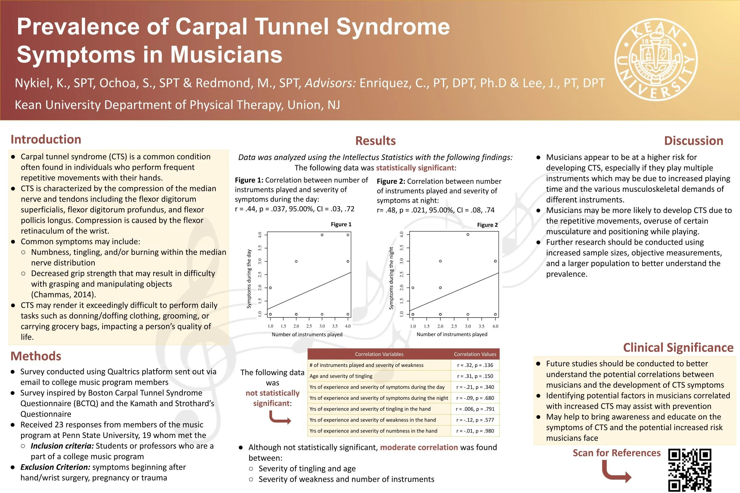 The purpose of this study is to help determine the prevalence of Carpal Tunnel Syndrome (CTS) symptoms among musicians using an online survey with questions inspired by the Boston Carpal Tunnel Syndrome Questionnaire (BCTQ) and the Kamath and Stothard’s Questionnaire. The research investigates various internal and external factors that may influence the severity and type of CTS related symptoms. Factors including age, years of experience, and number of instruments played were compared with the severity of symptoms during the day and at night including tingling, numbness and weakness. The results of this study suggest that a few factors produce a statistically significant impact on the prevalence of CTS symptoms in musicians. Limitations to this study include a sample size, lack of qualitative data, and subjectivity of responses, therefore, further research is needed to identify and understand the impact of different factors on the prevalence of CTS symptoms in the underserved population.