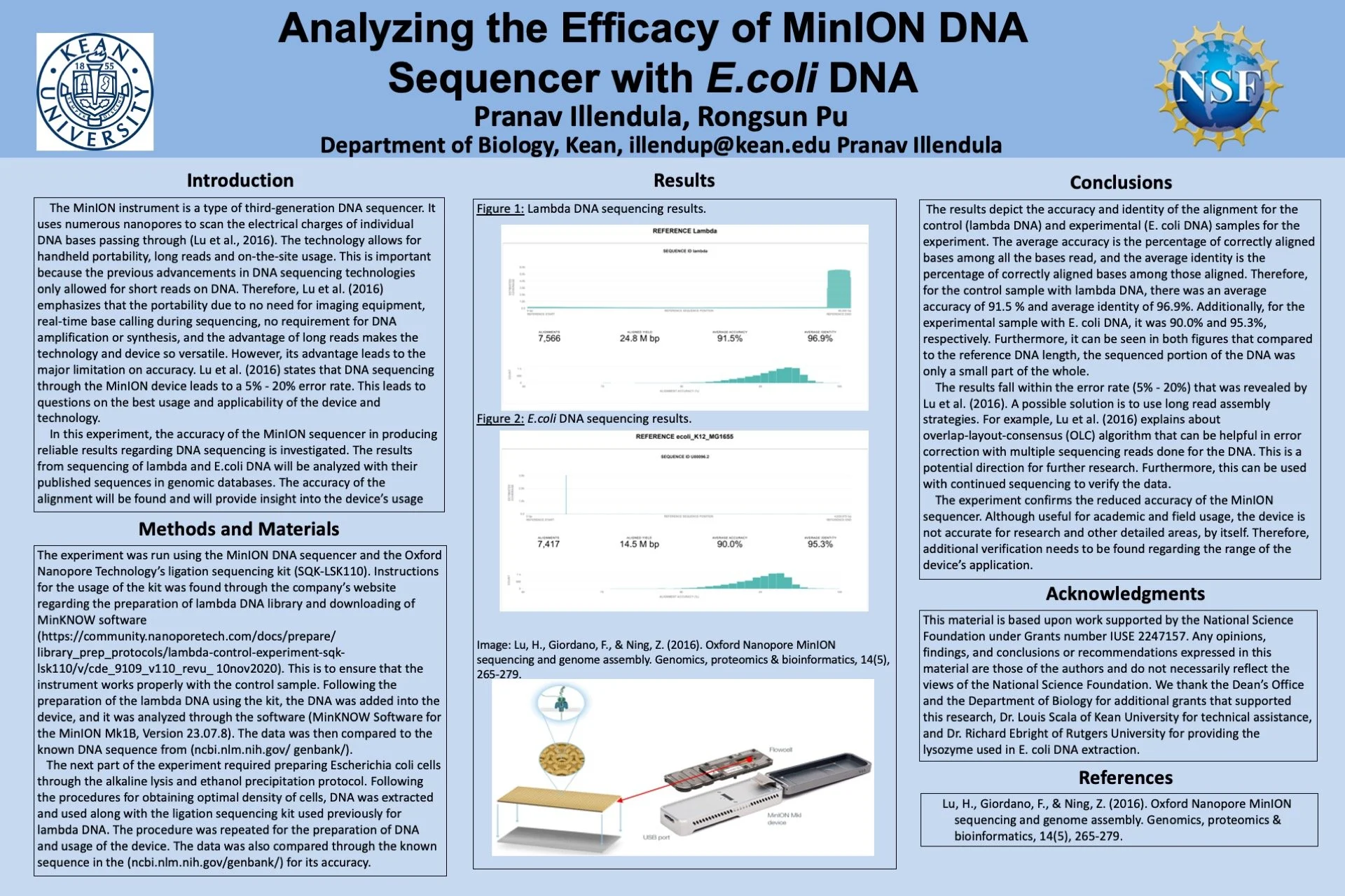 The MinION instrument exhibits the next generation of DNA sequencing. It uses nanopores to scan the electrical charge of the individual DNA bases passing through. Furthermore, the technology allows for handheld portability and on-the-site usage. The MinION sequencer's accuracy in producing reliable results within expected use was investigated. The instrument utilizes a flow cell containing the nanopores, a computer with appropriate software for the sequencing, and various buffers and reagents to prep the DNA. The experiment went through lambda and E.Coli DNA sequencing for control and experiment, respectively. The data collected is then compared using the known DNA sequence of the two samples to compare its accuracy. Therefore, the control sample with lambda DNA had an average accuracy of 91.5 % and an average identity of 96.9%. Additionally, the experimental sample with E. coli DNA was 90.0% and 95.3%, respectively. The error rate confirms that the reduced accuracy is only viable for on-field usage, and not for research purposes.