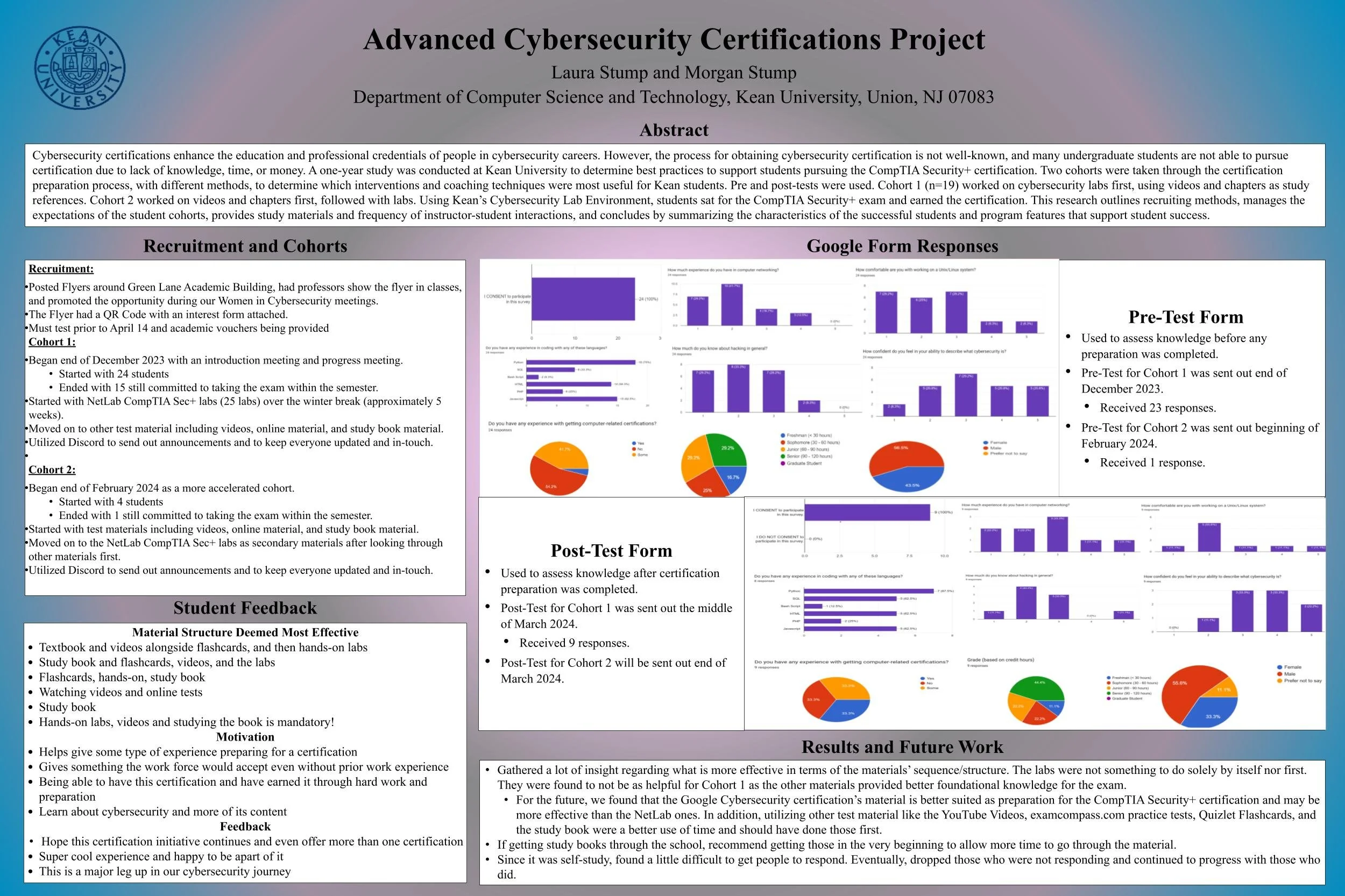 Cybersecurity certifications enhance the education and professional credentials of people in cybersecurity careers. However, the process for obtaining cybersecurity certification is not well-known, and many undergraduate students are not able to pursue certification due to lack of knowledge, time, or money. A one-year study was conducted at Kean University to determine best practices to support students pursuing the CompTIA Security+ certification. Two cohorts were taken through the certification preparation process, with different methods, to determine which interventions and coaching techniques were most useful for Kean students. Pre and post-tests were used. Cohort 1 (n=19) worked on cybersecurity labs first, using videos and chapters as study references. Cohort 2 worked on videos and chapters first, followed with labs. Using Kean’s Cybersecurity Lab Environment, students sat for the CompTIA Security+ exam and earned the certification. This research outlines recruiting methods, manages the expectations of the student cohorts, provides study materials and frequency of instructor-student interactions, and concludes by summarizing the characteristics of the successful students and program features that support student success.