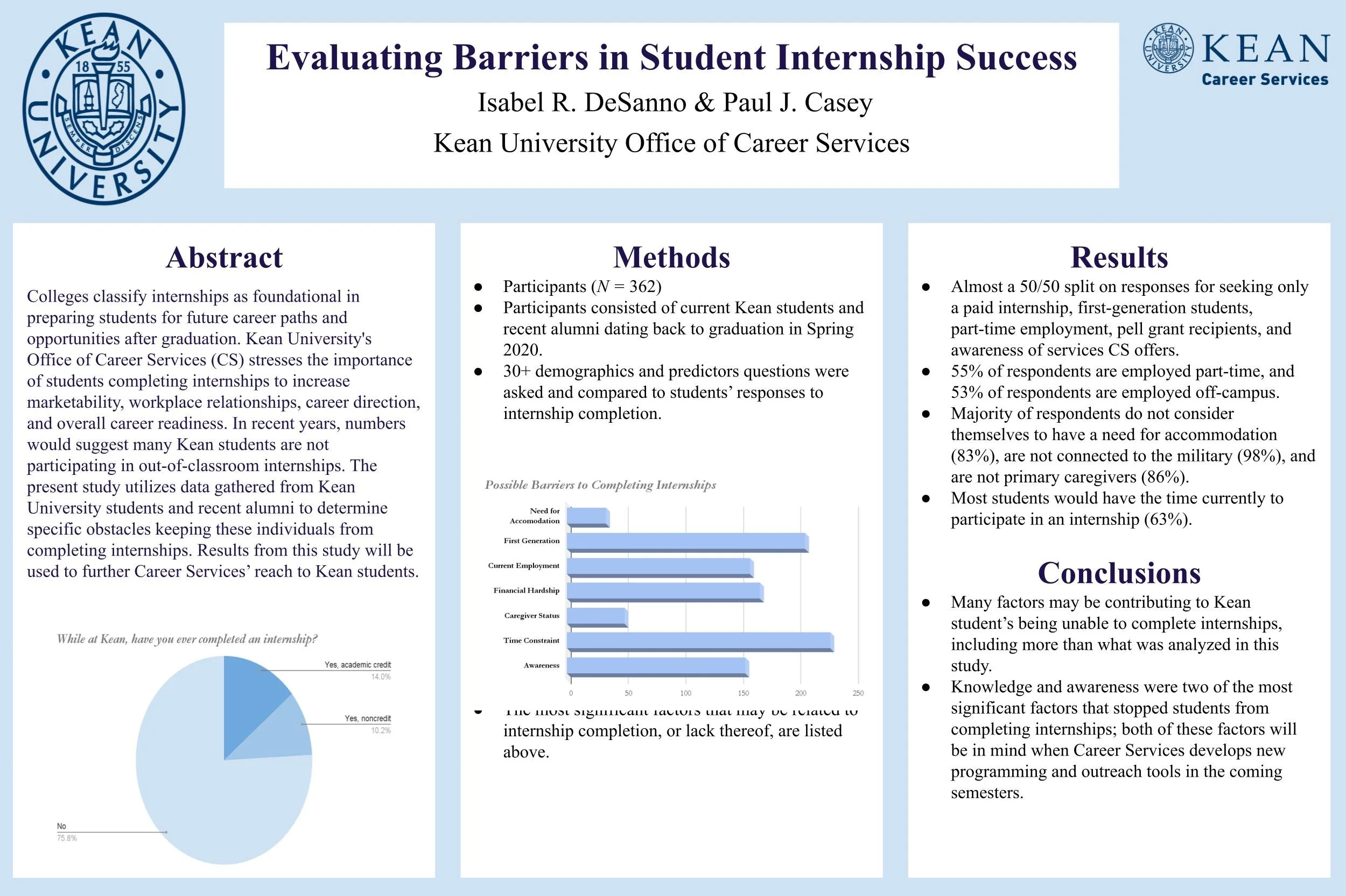 Colleges classify internships as foundational in preparing students for future career paths and opportunities after graduation. Interns refer to students or trainees who work in an organization, sometimes without pay, to gain work experience or satisfy requirements for a qualification. In many cases, students complete internships as an unspoken criterion or requirement of being qualified to work in a specific field after graduation. Internships teach many skills that are only learned in out-of-classroom settings. Like countless other career centers at universities around the United States, Kean University's Office of Career Services stresses the importance of students completing internships to increase marketability, workplace relationships, career direction, and overall career readiness. In recent years, numbers would suggest many Kean students are not participating in out-of-classroom internships and other experiential learning opportunities. In an effort to continue to serve the student population, Career Services is working towards breaking barriers students may face when finding and completing internships. The present study utilizes data gathered from Kean University students and recent alumni to determine specific obstacles keeping these individuals from completing internships. Results from this study will be used to further develop Career Services’ reach to Kean students.