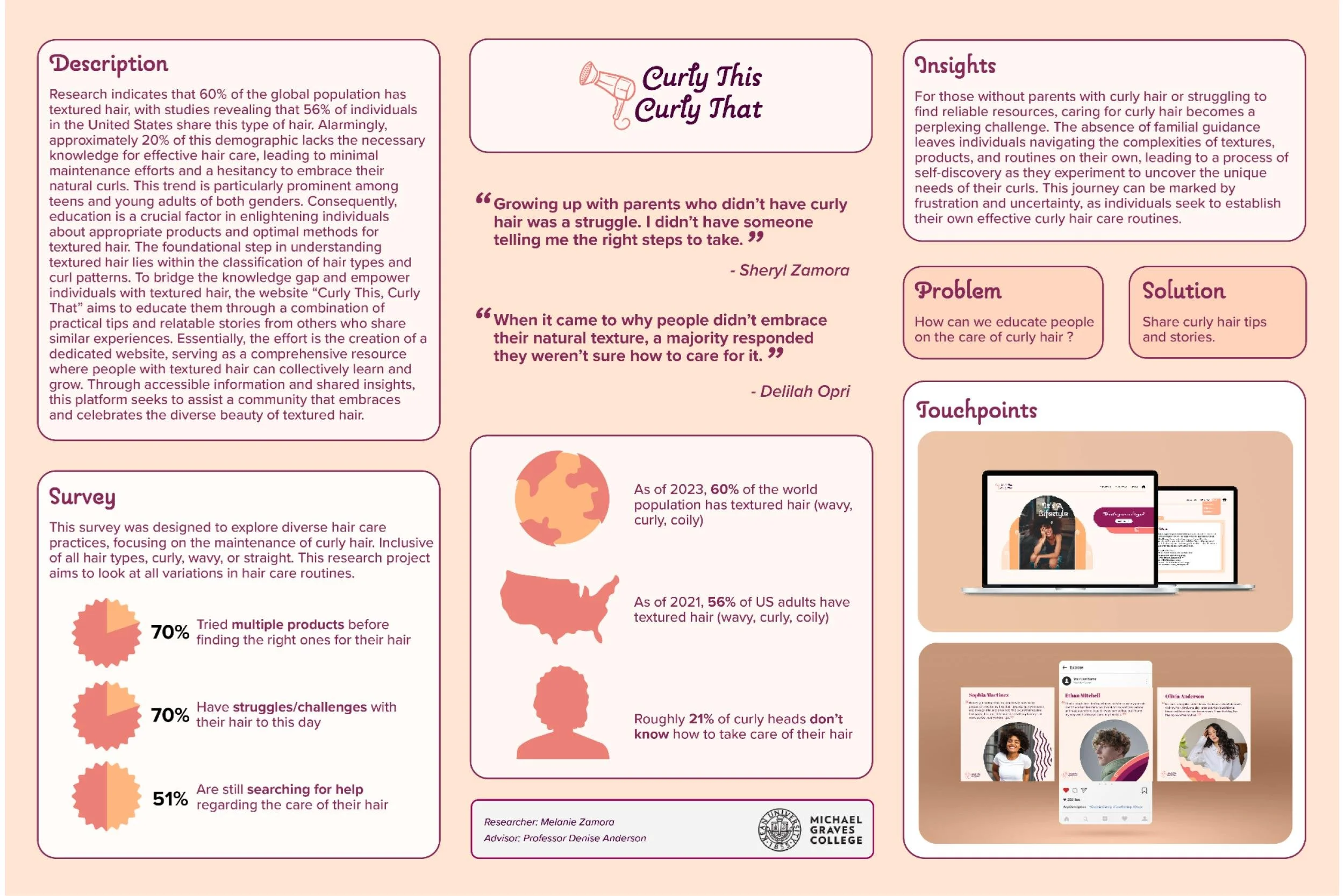 Research indicates that 60% of the global population has textured hair, with studies revealing that 56% of individuals in the United States share this type of hair. Alarmingly, approximately 20% of this demographic lacks the necessary knowledge for effective hair care, leading to minimal maintenance efforts and a hesitancy to embrace their natural curls. This trend is particularly prominent among teens and young adults of both genders. Consequently, education is a crucial factor in enlightening individuals about appropriate products and optimal methods for textured hair. The foundational step in understanding textured hair lies within the classification of hair types and curl patterns. To bridge the knowledge gap and empower individuals with textured hair, the website “Curly This, Curly That” aims to educate them through a combination of practical tips and relatable stories from others who share similar experiences. Essentially, the effort is the creation of a dedicated website, serving as a comprehensive resource where people with textured hair can collectively learn and grow. Through accessible information and shared insights, this platform seeks to assist a community that embraces and celebrates the diverse beauty of textured hair.