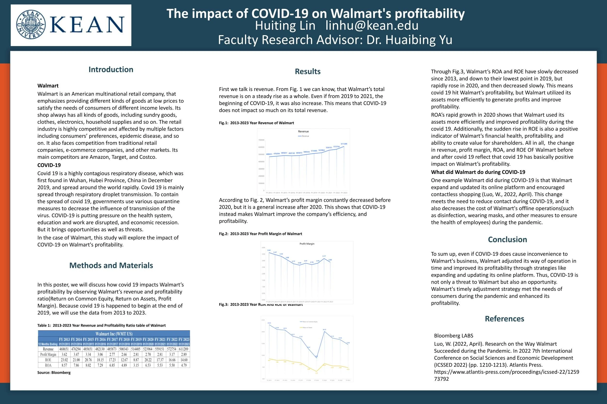 The COVID-19 pandemic has had a huge impact on the world economy, bringing both challenges and opportunities. In this context, Walmart as one of the world's largest retailers, is a key case study. The COVID-19 pandemic has affected Walmart in many ways. The pandemic has prompted a shift in consumer behavior, with lockdowns and social distancing measures forcing consumers to change their shopping habits. Consumer demand for cleaning supplies and personal protective equipment such as masks has surged. At the same time, COVID-19 has prompted Walmart to beef up its e-commerce capabilities, strengthen in-store security measures, and optimize its supply chain (because COVID-19 caused disruptions to global supply chains, leading to challenges in sourcing products and increased transportation costs). That's why the coronavirus pandemic will have an impact on Walmart's profitability. Therefore, this paper will study the impact of COVID-19 on Walmart's profitability by analyzing four values: revenue, profit margin, return on assets (ROA), and return on equity (ROE).