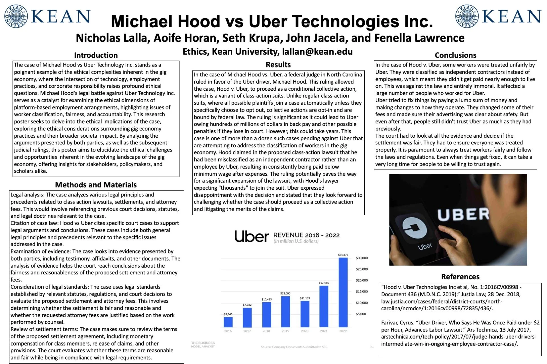 The case of Michael Hood vs Uber Technologies Inc. stands as a significant emblem of the ethical complexities inherent in contemporary labor practices within the working economy. This research poster strives to scrutinize the ethical dimensions embedded within the case, exploring the multiple issues arising from the classification of workers, their rights, and the ethical responsibilities of technology corporations. Through a thorough examination of the case details and prominent ethical theories, this project aims to illuminate the ethical dilemmas faced by both Uber and its drivers.
