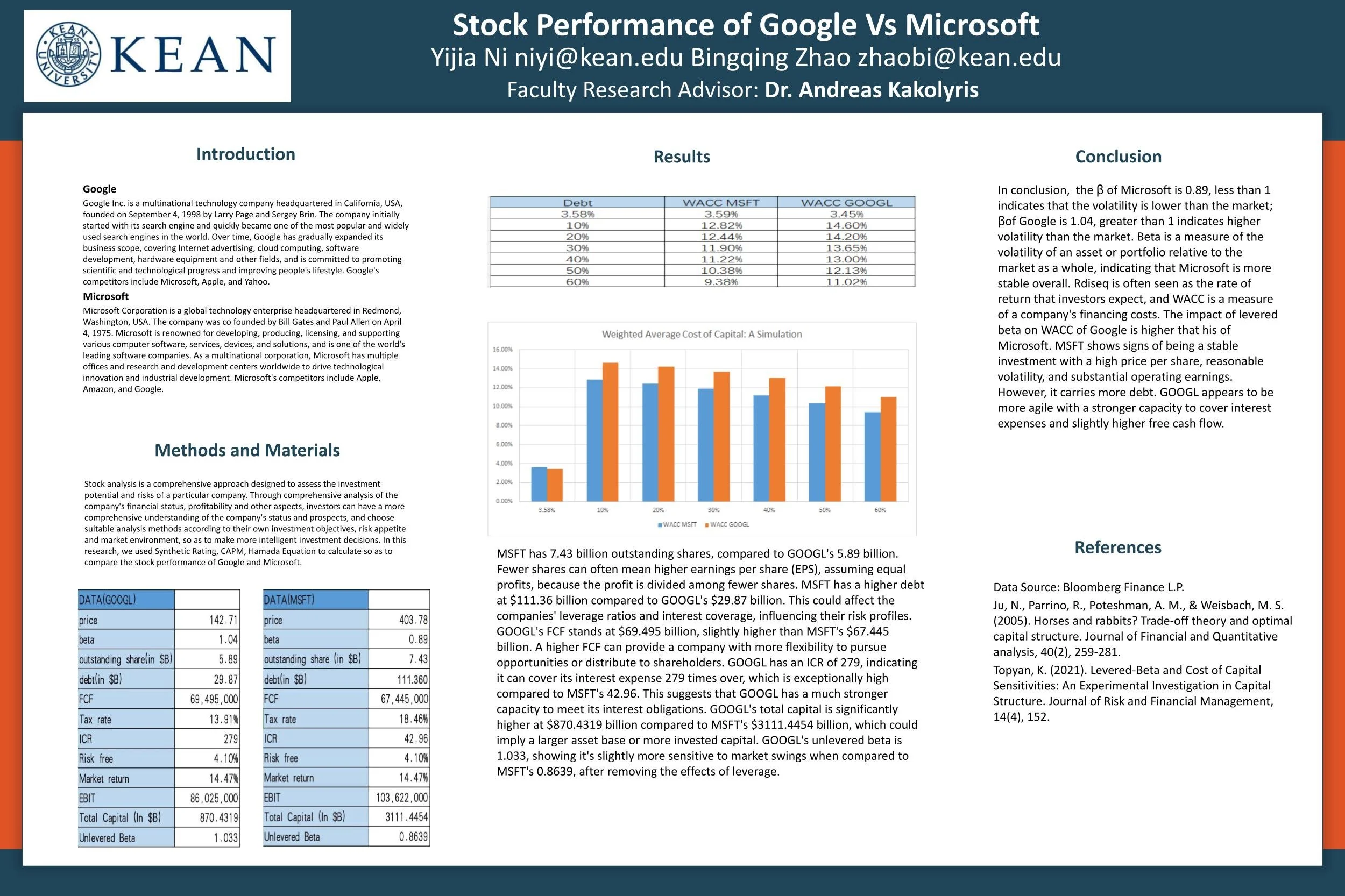 This article will compare the stock performance of Google and Microsoft, these two companies both have important positions in the technology industry. Google derives its revenue mainly from advertising, including search ads, YouTube ads, mobile ads, which makes Google one of the largest online advertising companies in the world. Microsoft generates revenue from software licensing fees, cloud computing services (Azure), Office software (Office), games (Xbox), hardware (Surface), and cloud computing services is one of its fastest growing businesses. In this research, we used Synthetic Rating, CAPM, Hamada Equation to calculate so as to compare the stock performance of Google and Microsoft, investors can have a more comprehensive understanding of the company's status and prospects. In the future, as the technology industry continues to evolve and change, both Google and Microsoft will continue to maintain their leading positions and provide more innovative products and services to users around the world. Our final research results will be presented and analyzed in the poster.