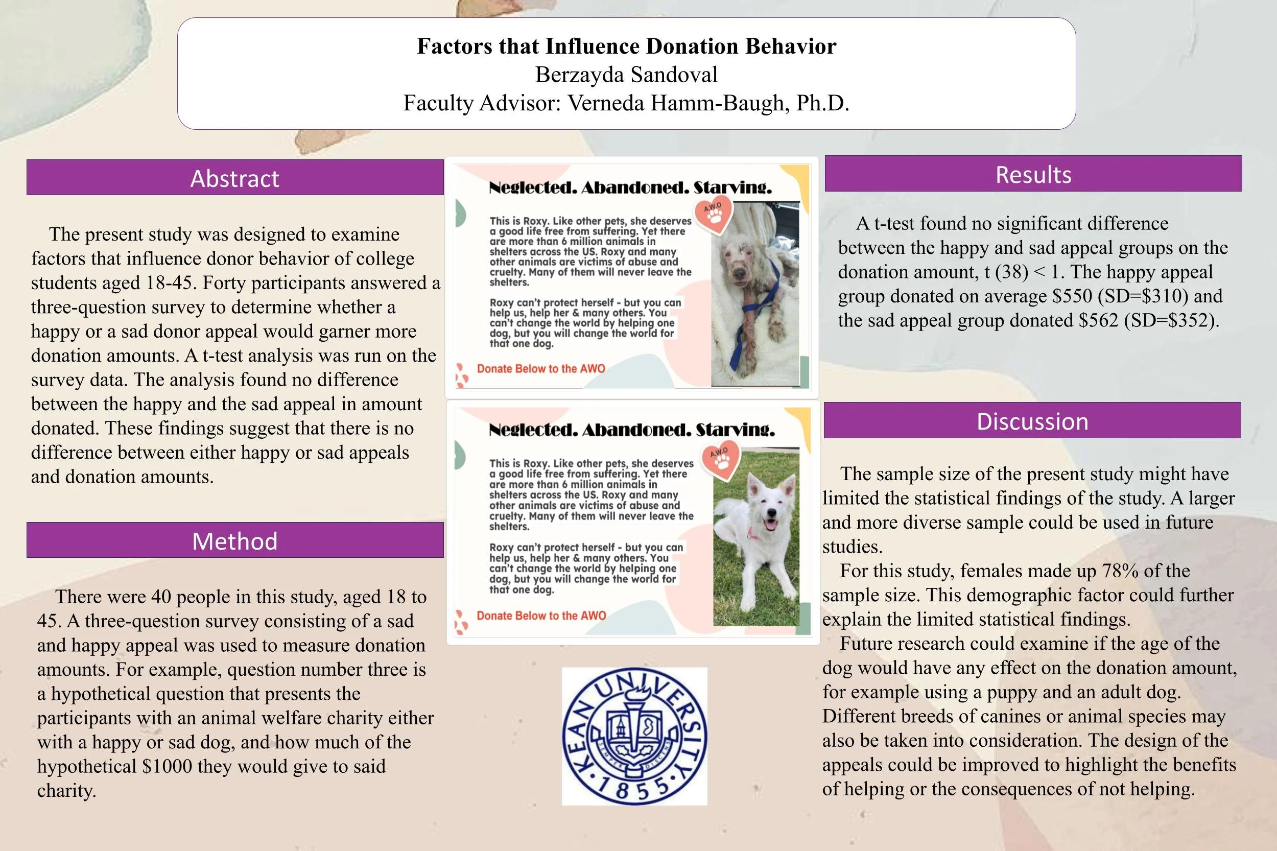 Donation behavior is defined as the act of voluntarily giving one’s time, money, or goods to someone or causes in times of need. Donation behavior has been widely studied in both marketing and psychology to find what factors ultimately are linked to the act of donating. Numerous factors can contribute to the willingness to donate. Donating is often seen on a monetary basis but there is also volunteering of one’s time to causes as well. The present study was designed to examine factors that influence donor behavior of college students aged 18-45. Forty participants answered a three-question survey to determine whether a happy or a sad donor appeal would garner more donation amounts. A t-test analysis was run on the survey data. The analysis found no difference between the happy and the sad appeal in amount donated. These findings suggest that there is no difference between either happy or sad appeals and donation amounts.