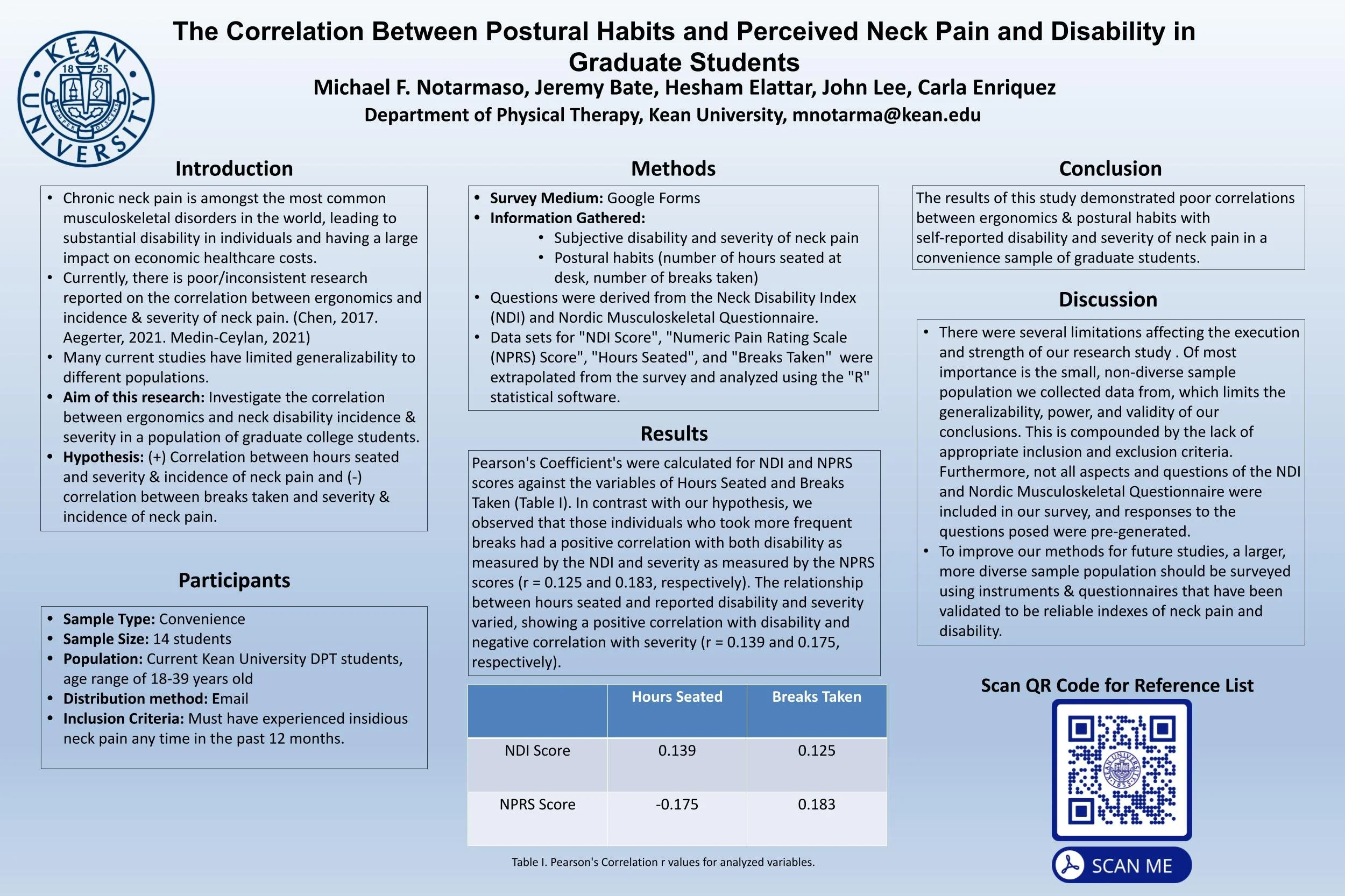 The purpose of this study was to investigate the relationship between positional habits among students with insidious neck pain and the amount of perceived neck pain and disability they experienced. Participants (n=14) from Kean University’s Doctor of Physical Therapy program who had experienced insidious onset of neck pain in the past 12 months provided self-reported information regarding demographics, daily postural and work habits, as well as their perception of the severity and disability associated with their instance of neck pain via a Google Forms survey. These outcome measures have been utilized in previous studies to determine correlations between ergonomics/computer usage and neck pain intensity.