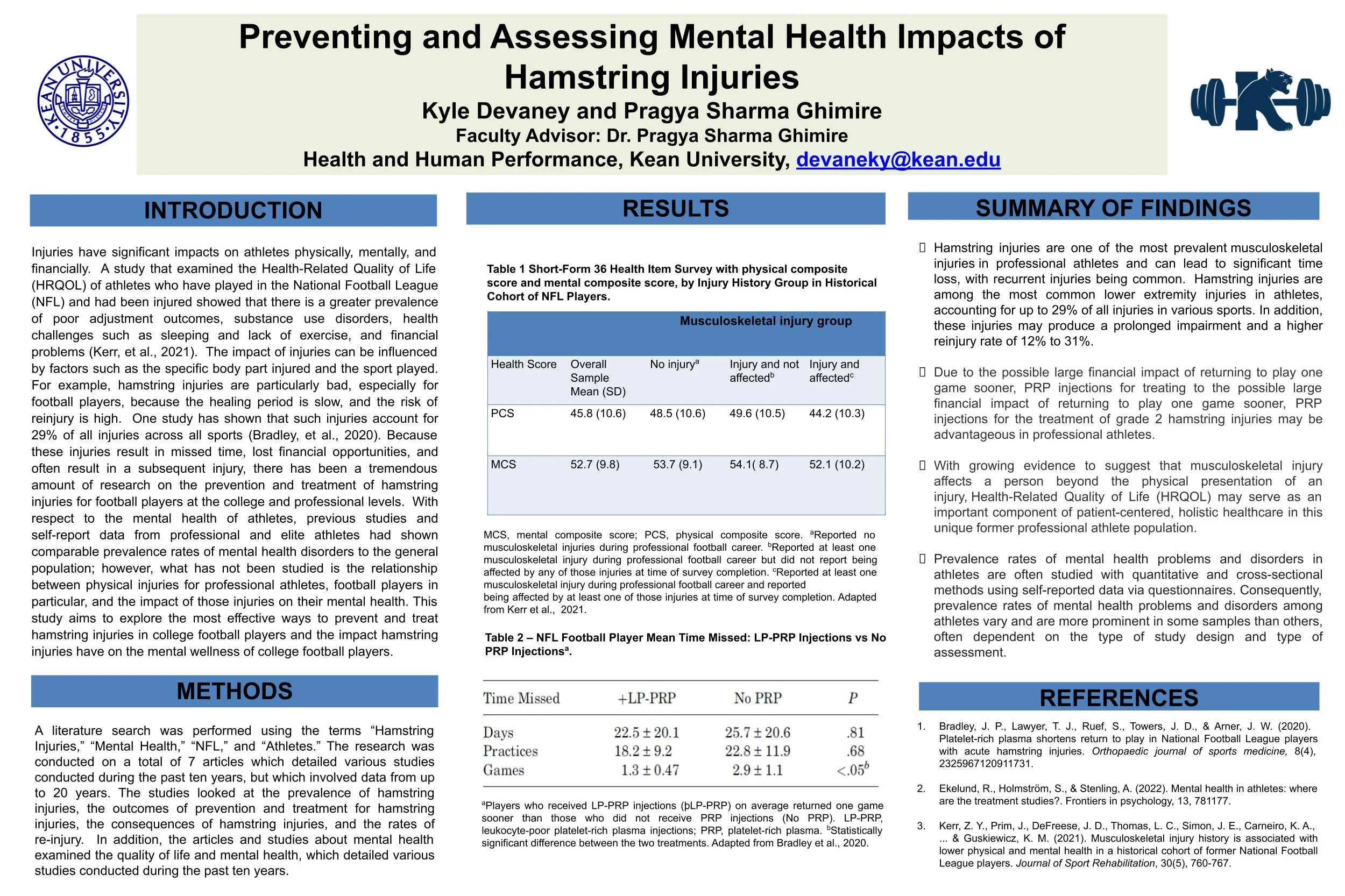 Many athletes from different sports suffer severe physical injuries that impact their ability to play the sport they love, and sometimes, it may also impact their income potential, particularly among professional athletes. Furthermore, these injuries often affect athletes mental and psychological well-being. Among the most debilitating injuries, hamstring injuries pose a considerable challenge, especially for football players, given their protracted healing process and heightened risk of recurrence. Research indicates that such injuries constitute a substantial portion, approximately 29%, of all sports-related injuries. Recent literature has emphasized the need for increased focus on evidence-based practice in sports medicine, particularly in documenting the comprehensive status and impairments post-injury. Notably, these injuries impact National Football League (“NFL”) players, with statistics revealing that muscle strain account for 46% of practice injuries and 22% of preseason game injuries. Given the consequences of these injuries, including missed game time, financial losses, and the likelihood of subsequent injuries, extensive research has been undertaken to prevent and treat hamstring injuries among collegiate and professional football players. Moreover, beyond the physical ramifications, athletes also contend with mental health challenges. For example, being injured may cause an athlete to feel depressed, anxious, stressed, and or traumatized. Although previous studies and self-reported data from professional and elite athletes have indicated similar prevalence rates of mental health disorders compared to the general population, the relationship between physical injuries, especially among professional athletes like football players, and the subsequent impact on their mental well-being remains unexplored. Therefore, this study aims to examine what connection, if any, exists between the physical injuries of athletes and the mental wellness of athletes. We hypothesize that lower body strength training will effectively decrease the incidence of hamstring injuries while also suggesting that hamstring injuries may elevate the likelihood of mental health disorders among football players. We will evaluate the results of Health-Related Quality of Life and information offered during qualitative interviews with the athletes.