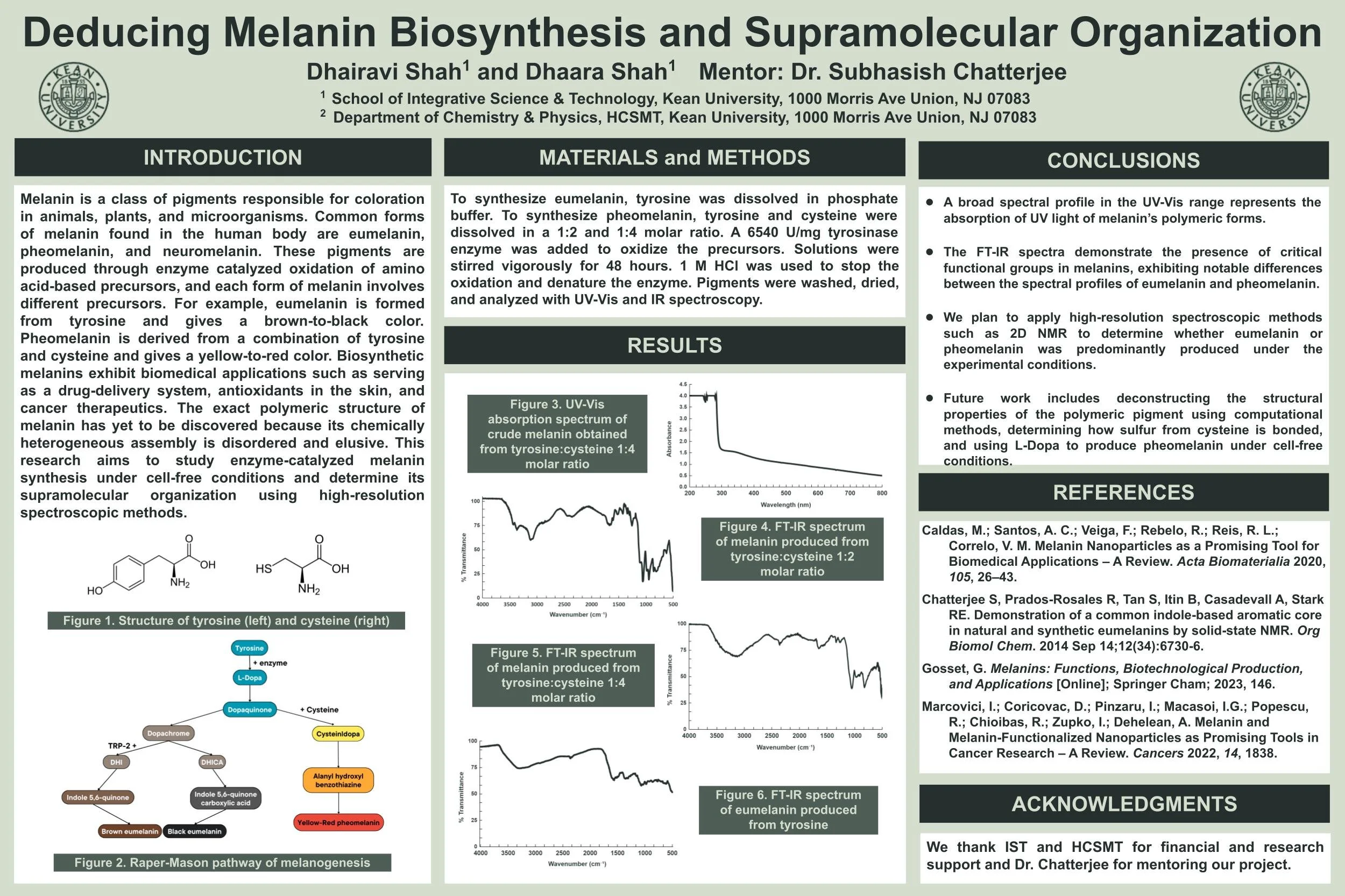 Melanin is a class of natural pigments responsible for structural coloration in animals, plants, and microorganisms, and the pigments are generated through the enzyme-catalyzed oxidation of catecholamines and amino acid-based precursors. Three forms of melanin are found in the human body: eumelanin, pheomelanin, and neuromelanin. Notably, different precursors produce different kinds of polymeric melanins. For example, the most common precursor, tyrosine, produces eumelanin, which gives a brown-to-black color pigment. On the other hand, pheomelanin is derived from a combination of tyrosine and cysteine and gives a yellow-to-red color pigment. Furthermore, biosynthetic melanins exhibit biomedical applications such as serving as a drug-delivery system, antioxidants in the skin, and cancer therapeutics. Biosynthetic melanin is also valuable in the industry, where it can be used as optically active 2D hybrid materials for biosensing, reinforcers for adhesive hydrogel materials, and as free radical scavengers for soil remediation. The exact polymeric structure of melanin has yet to be discovered because its chemically heterogeneous assembly is disordered and elusive. Our experimental project aims to study enzyme-catalyzed melanin synthesis under cell-free conditions and determine its supramolecular organization using high-resolution spectroscopic and computational methods. The current results illustrate the structural heterogeneity of pheomelanin-like polymeric materials, paving the way for comprehensive structural characterization to shed light on the macromolecular architecture of hybrid pigments.