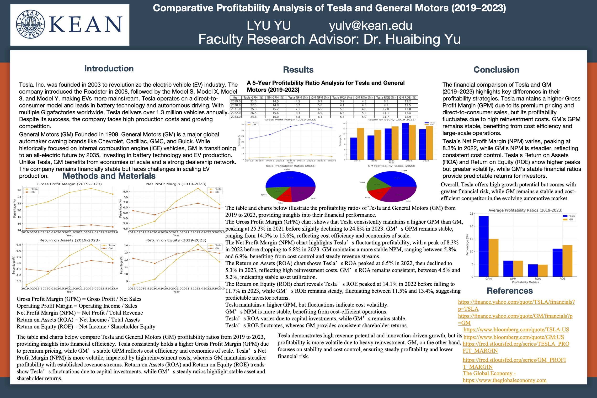 In the rapidly evolving automotive industry, understanding financial performance is crucial for assessing the sustainability and profitability of companies. This research examines the financial performance of Tesla Inc. and General Motors (GM) from 2019 to 2023, comparing key profitability ratios such as Gross Profit Margin, Operating Profit Margin, Net Profit Margin, Return on Assets (ROA), and Return on Equity (ROE). The study aims to analyze how these companies have navigated market dynamics, supply chain challenges, and technological advancements.The research methodology involves collecting financial data from publicly available sources such as Yahoo Finance, Bloomberg, and the Federal Reserve Economic Database (FRED). Data analysis is conducted using financial ratio calculations to evaluate profitability and efficiency. Tesla, known for its electric vehicle innovation, has shown significant revenue growth but faces high production costs. General Motors, a long-established automaker, has leveraged economies of scale but faces competition in the EV market.The results indicate that Tesla has a higher gross profit margin than GM, reflecting its premium pricing and cost efficiencies in production. However, GM maintains a more stable net profit margin due to its diversified vehicle portfolio and well-established supply chain. Tesla's ROE and ROA have been volatile, reflecting the company’s rapid expansion and reinvestment in technology. In contrast, GM’s ROE remains steady, supported by consistent revenue streams and cost management.This research provides valuable insights into the financial health of these industry giants, highlighting Tesla’s aggressive growth strategy and GM’s stable profitability. The findings have practical implications for investors, industry analysts, and policymakers in understanding the financial strengths and risks associated with traditional and electric automakers. Future research could explore the impact of government regulations and global supply chain disruptions on financial performance.