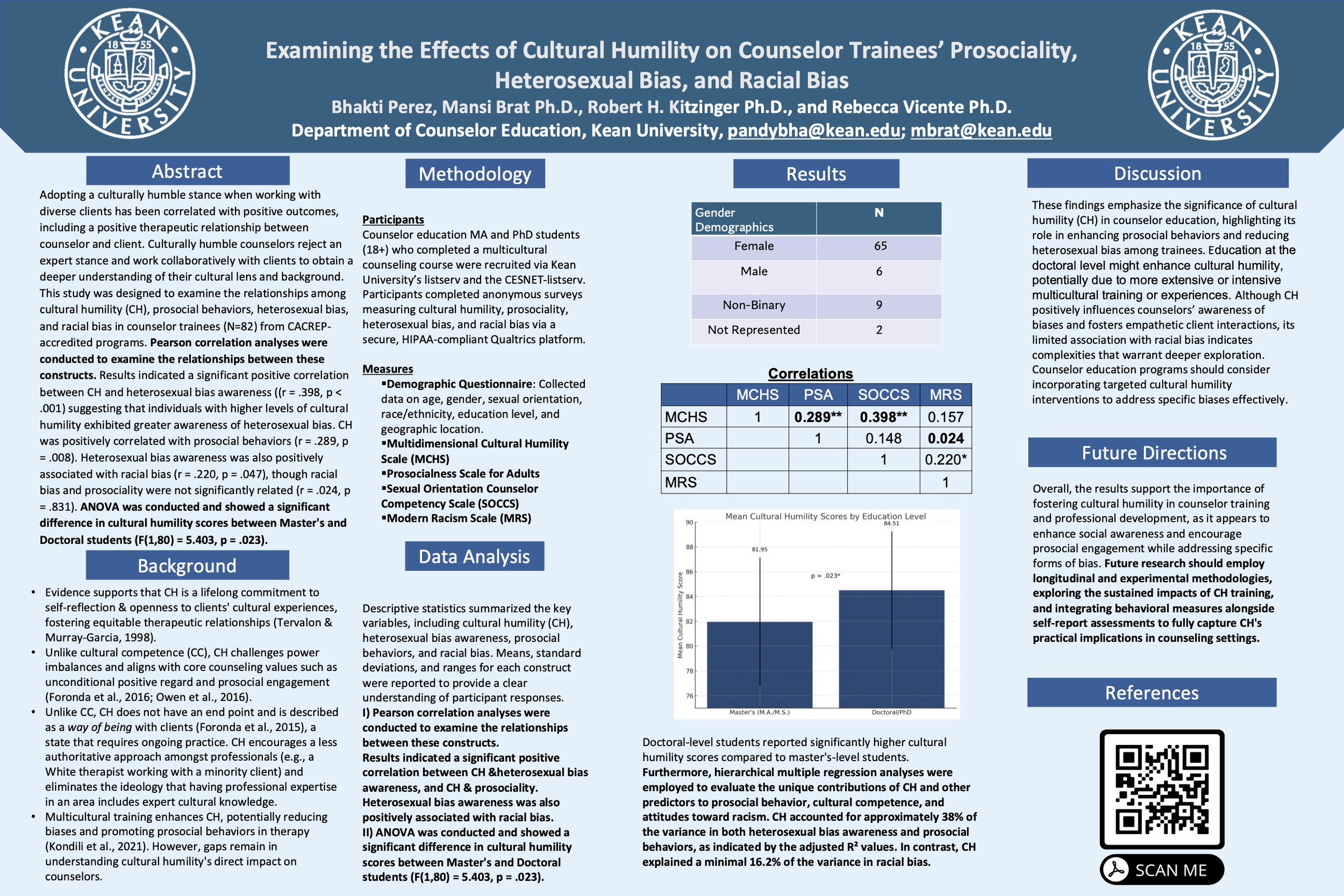 Cultural humility (CH) is a foundational principle in multicultural counseling and a critical component for mental health therapists in training. Framed as a lifelong journey of self-reflection and self-examination, cultural humility (CH) differs from cultural competence (CC) by prioritizing ongoing learning about clients' unique cultural experiences rather than simply accumulating cultural knowledge (Tervalon & Murray-Garcia, 1998). CH is an embodied stance that addresses power imbalances between therapists and clients, fostering equitable and compassionate therapeutic relationships.Ortega and Faller (2011) define CH as an approach that considers the intersectionality of individual identities, beliefs about power, lived experiences, trauma histories, and systemic resource disparities. Unlike multicultural frameworks that view culture as monolithic, cultural humility (CH) embraces a holistic approach through three key dimensions: self-awareness in shaping one's worldview, openness to understanding others' lived experiences and transcendence. This moral orientation acknowledges a greater existence beyond the self. CH is not a fixed competency but an ongoing practice and a way of being with clients (Foronda et al., 2015). Therapists trained from this approach challenge hierarchical therapeutic dynamics and the assumptions that professional expertise equates to cultural expertise. While CC emphasizes counselors' awareness, knowledge, skills, and actions in diverse settings, CH aligns with therapeutic attributes such as unconditional positive regard, fostering prosocial engagement, and reducing defensiveness in client interactions (Owen et al., 2016).The aims of this study were - (1) to assess cultural humility levels among counselor trainees enrolled in CACREP-accredited MA and PhD programs and (2) to examine correlations between cultural humility and racial bias, prosociality, & heterosexual bias among counselor trainees. Participants included adults (ages 18+) are Counselor Education students who completed anonymous questionnaires measuring the four constructs (cultural humility, prosociality, heterosexual bias, and racial bias). Data was collected via a secure, HIPAA-compliant platform using Qualtrics. The findings of this study will enhance understanding of the role of cultural humility (CH) in emerging counselor education, training, and supervision. Additionally, researchers will note findings of the relationship between CH, bias, and prosocial tendencies, providing valuable insights and implications for multicultural counseling training and practice.