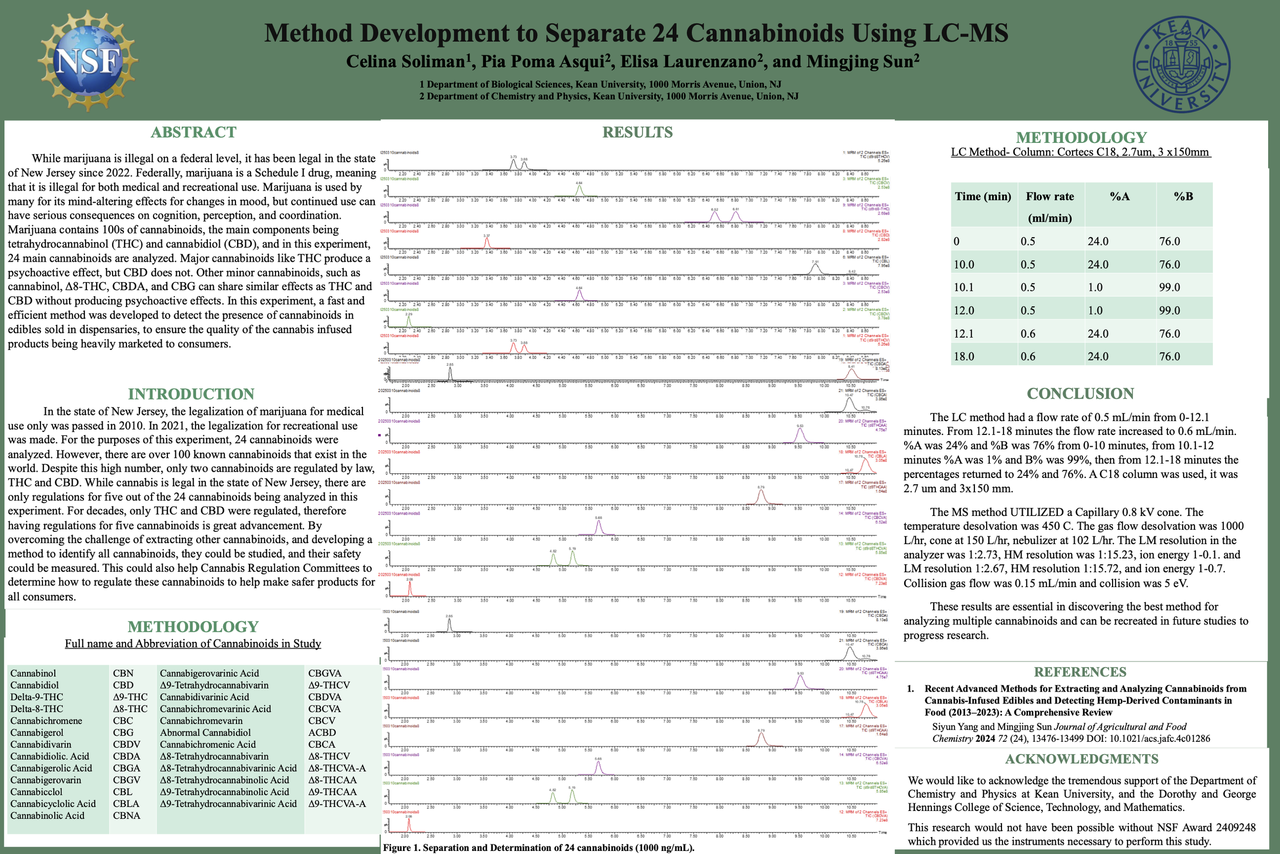 While marijuana is illegal on a federal level, in the state of New Jersey it has been legal since 2022. Federally, marijuana is a Schedule I drug, meaning that it is illegal for both medical and recreational use. Marijuana is used by many for its mind-altering effects for changes in mood, but continued use can have serious consequences on cognition, perception, and coordination. Marijuana contains 100s of cannabinoids, the main components being tetrahydrocannabinol (THC) and cannabidiol (CBD), and in this experiment, 24 main cannabinoids are analyzed. Major cannabinoids like THC produce a psychoactive effect, but CBD does not. Other minor cannabinoids, such as cannabinol, Delta 8 THC, CBDA, and CBG can share similar effects as THC and CBD without producing psychoactive effects. In this experiment, a fast and efficient method was developed to detect the presence of cannabinoids in edibles sold in dispensaries, to ensure the quality of the cannabis infused products being heavily marketed to consumers.