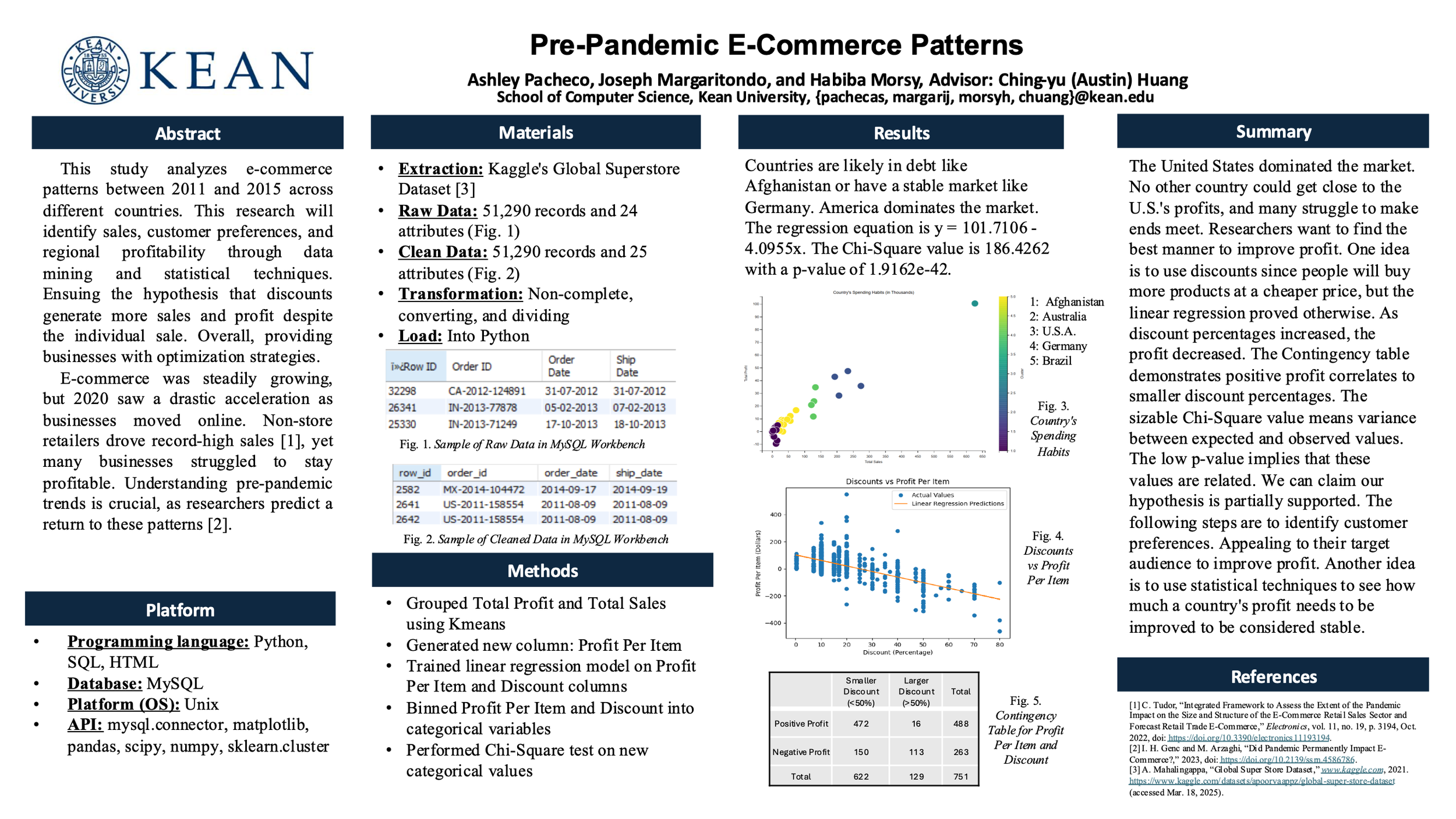 The rapid growth of e-commerce has transformed global consumer behavior due to the Covid-19 pandemic. This study analyzes e-commerce patterns between 2011 and 2015, focusing on pre-pandemic trends across different countries. Using the Global SuperStore Dataset from Kaggle, which has a raw data size of 7,848 KB containing 51,290 records and 24 attributes, we examine raw data factors such as products, shipping costs, profit, and discount effectiveness to determine demand patterns and profitability across regions. The dataset has been cleaned and processed to enhance analysis, with additional engineered features such as Delivery Time and Aggregated Sales & Profit to improve insights. The final dataset is stored either as a CSV file for further analysis or in a MySQL database for querying. This structured data allows for effective application of data mining techniques, helping to identify trends in e-commerce sales, customer preferences, and regional profitability. After preprocessing is complete, the dataset is analyzed using both data mining and statistical techniques. Clustering is used to group customers from different countries and identify spending habits, and regression is used to make predictions about future profits and types of customer purchases. Furthermore, measures of central tendency such as mean and median are calculated to provide further insight into the distribution of data points. With this analysis, this study expects to find that discounts do indeed generate more sales and overall profit, despite the lowered profit per individual sale. It is also expected that favored categories of purchases exist and are discernable from each country described in the dataset, though no prediction is made on what those particular categories are. This research provides insights into consumer preferences, regional sales trends, and logistical efficiencies, offering valuable information for businesses seeking to optimize their e-commerce strategies.